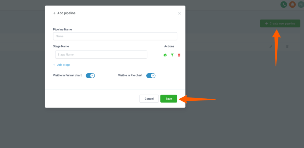 - NOTE: you can determine whether or not each individual stage is visible in the pie chart and funnel chart, as well as choose if the entire pipeline as a whole is visible or not.