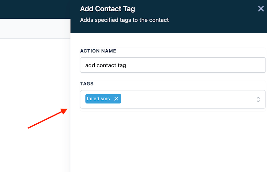 - Choose “Add Contact Tag” and type in the name of the tag you created in Step 1 (such as “Failed SMS”.)
