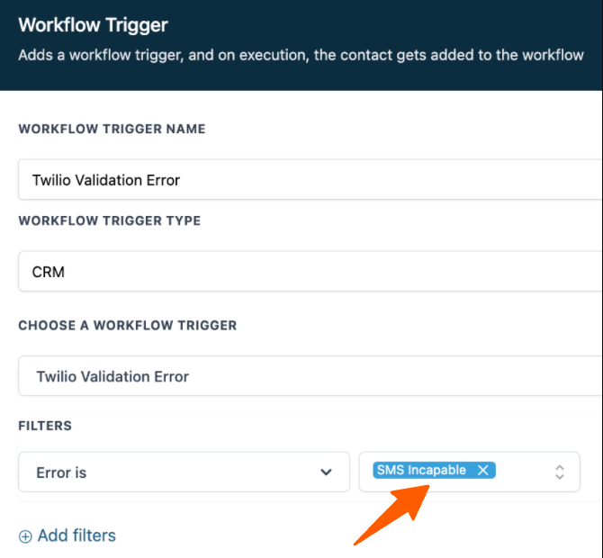- Create a new Workflow in the builder, and set up a trigger for “Twilio Validation Error”.