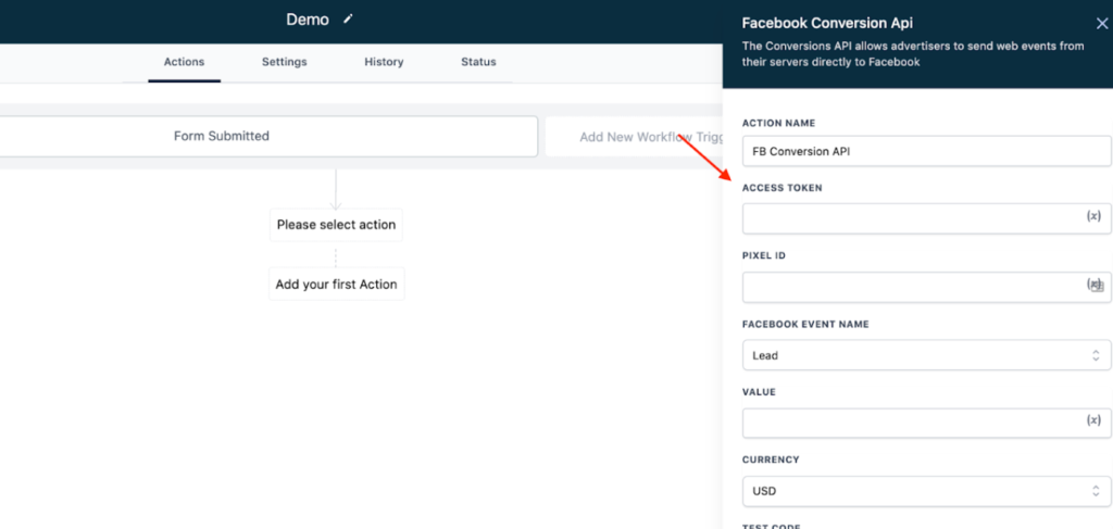 - NOTE:If you wish to run a test, you can copy the Facebook Pixel Test Code from the Settings, paste it here into the “Test Code” field, and then run a test of the workflow. To run the test, the workflow must actually be triggered by an event (like a form submission). The “Test Workflow” button doesn’t allow testing FB conversions with API.