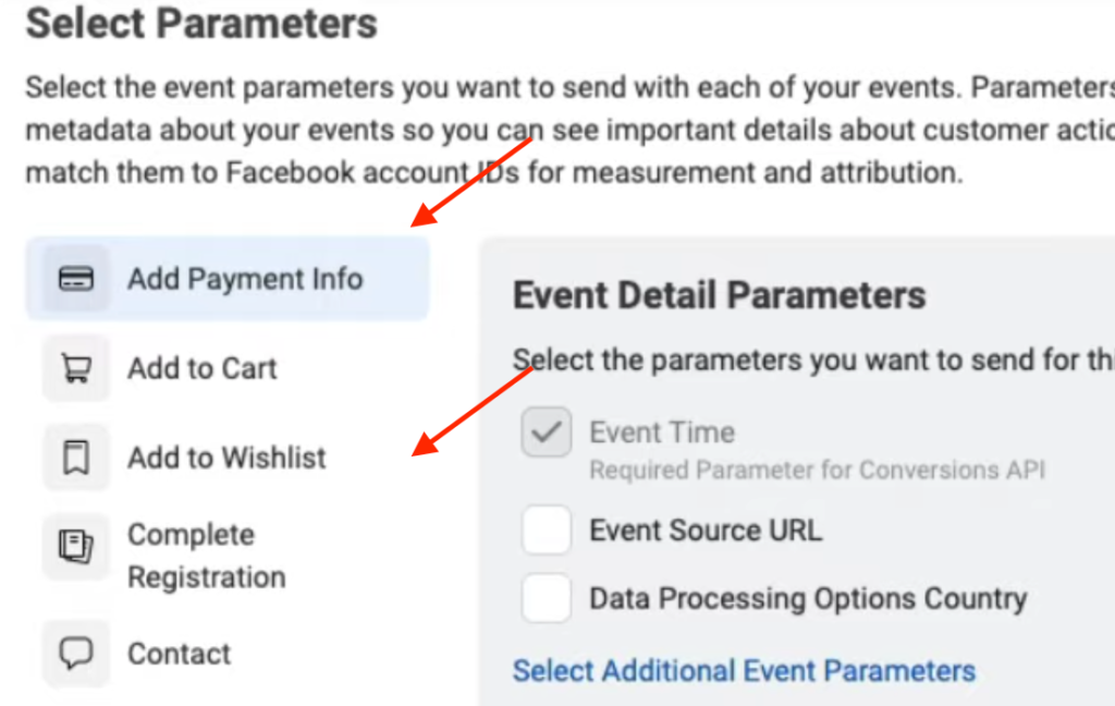 - Repeat the Parameters selection for each event you selected (such as Find Location, Add to Cart, etc.)