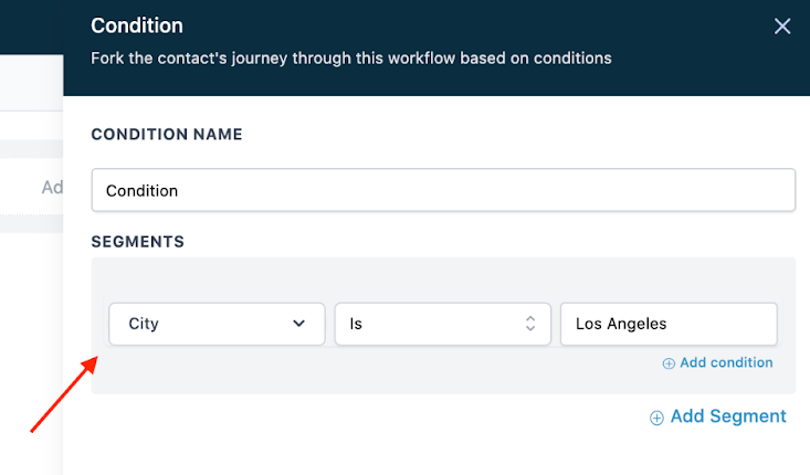 - Add one or more Segment and Operator, choosing from the dropdowns to customize the action. (In the GIF above, I set the condition so anyone with “Los Angeles” as their City, and anyone without the name Bob, would go down 1 path of the workflow. Anyone else would go down the 2nd path.)